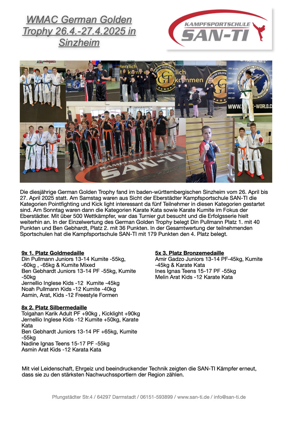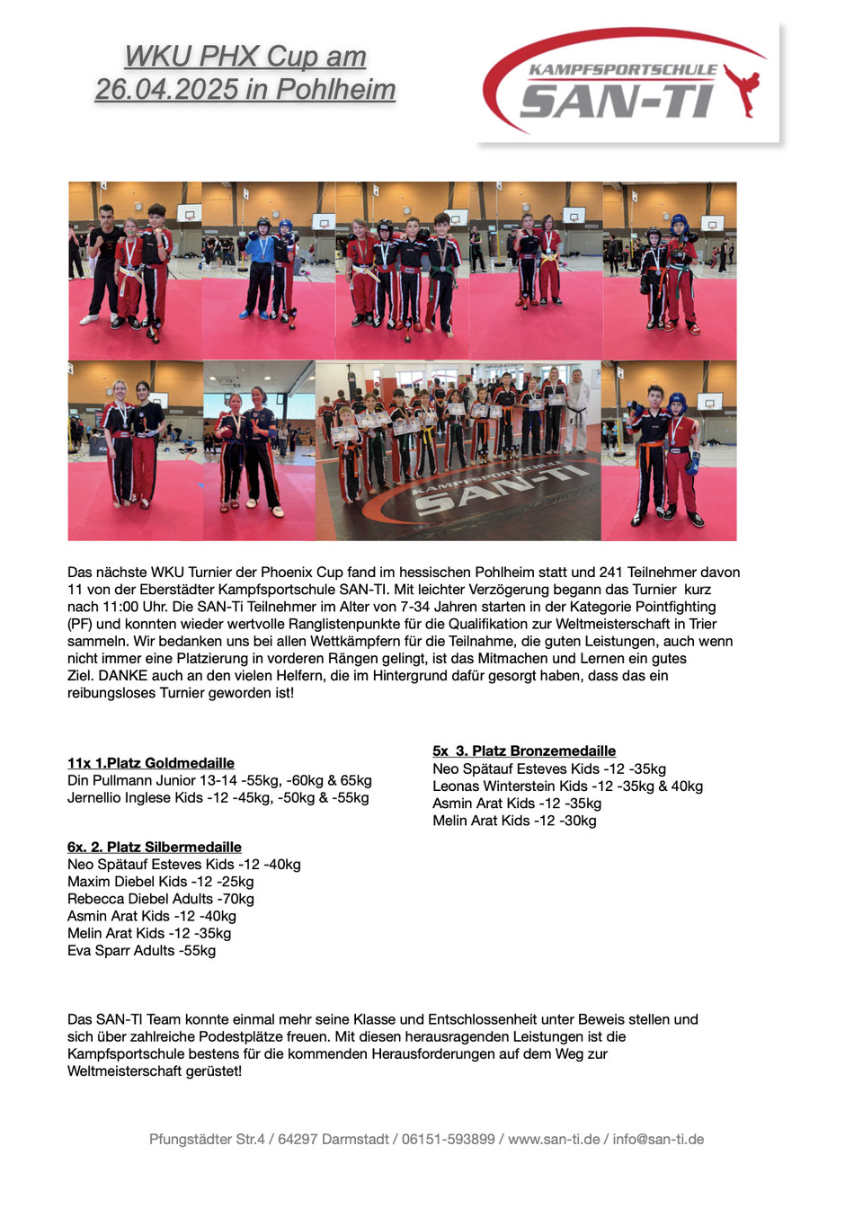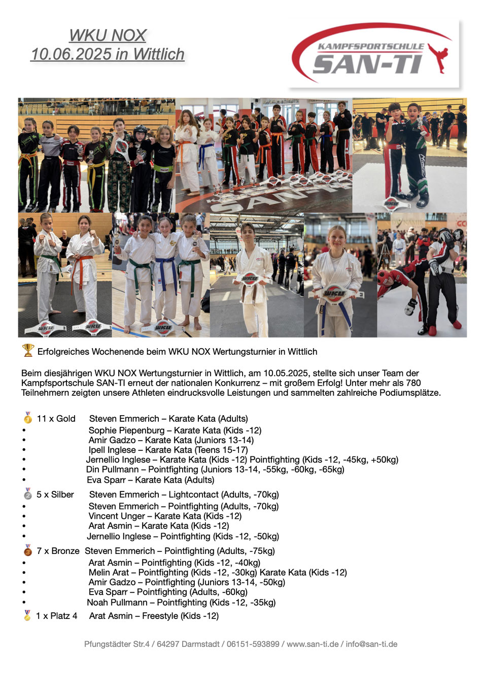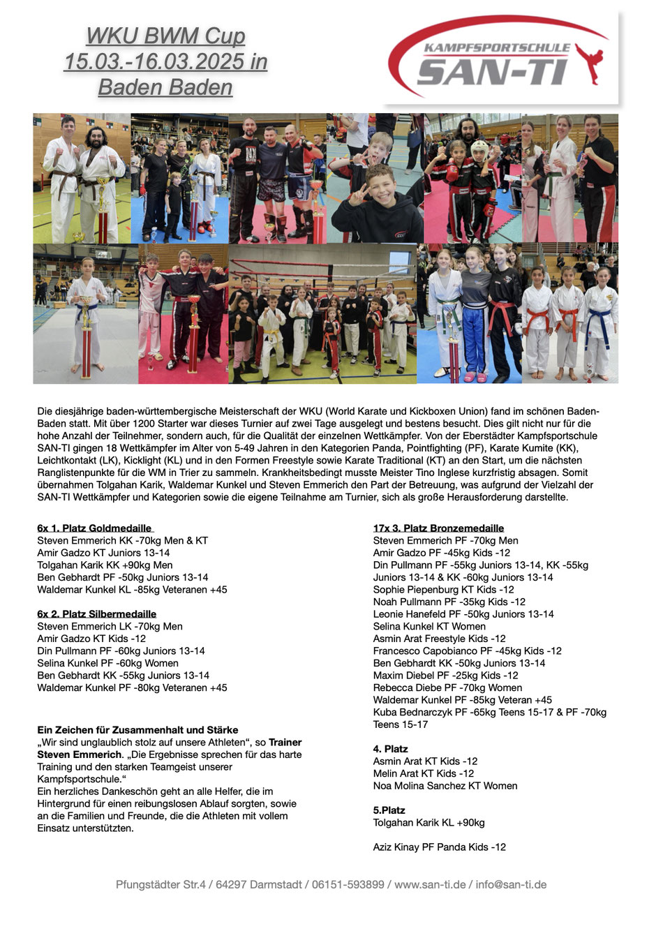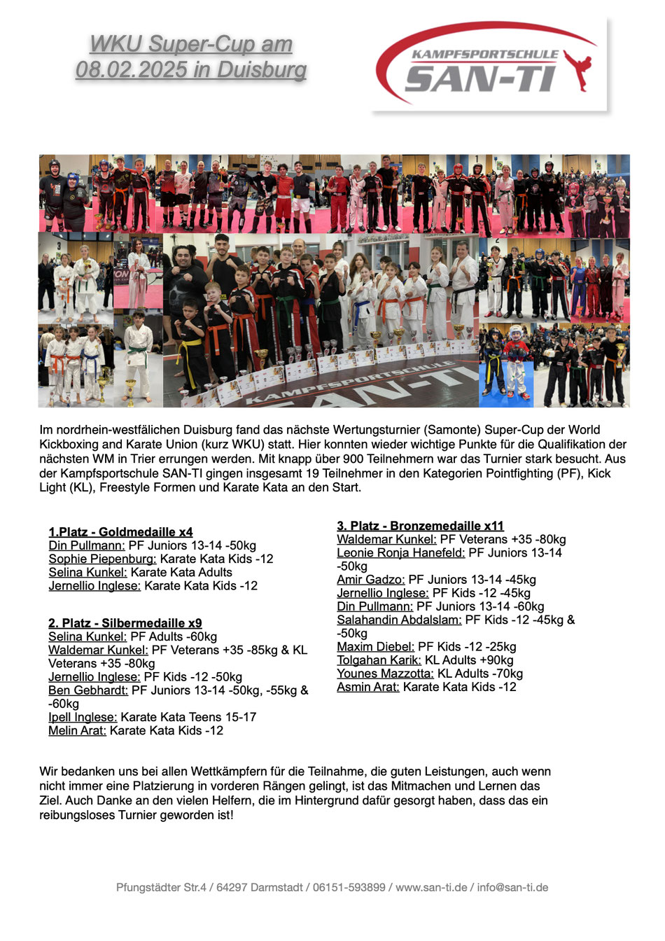 Für die Kampfsportschule San-Ti gingen neun Starter in den Disziplinen Pointfighting und Karate Kata an den Start und sicherten sich wichtige Ranglistenpunkte für die diesjährige Weltmeisterschaft. Den Anfang macht Nils Hopf bei den Kids. Er sicherte sich einen zweiten Platz in der Disziplin Karate Kata sowie einen vierten Platz im Pointfighting -45kg. Kira Kirscht belegte den vierten Platz in der Formenklasse Karate Kata Damen. Pasqualino Manno und Erkan Aykul kämpften beide in der Pointfighting Jugendklasse -55kg und belegten den ersten und den dritten Platz. Vanessa Carlomagno unterlag im Finale der Klasse Pointfighting weibliche jugend -50kg und sicherte sich den zweiten Platz. Jonas Kleinsorge belegte bei seinem ersten Turnier einen vierten Platz bei den Herren Farbgurten -80kg. Sascha Heilbronn startete eine Gewichtsklasse höher und gewann diese. Meike Söker siegte in der Klasse Pointfighting Damen +65kg.